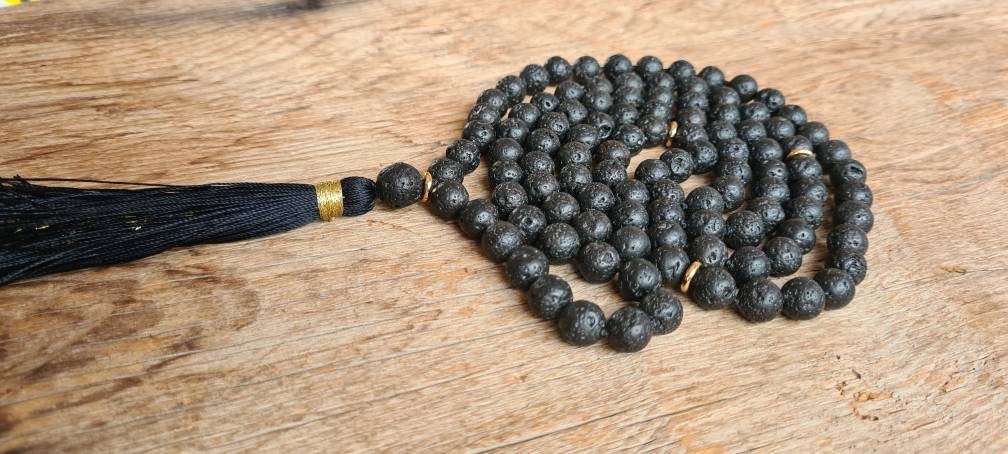 108 Black Lava Stone Mala, Yoga Necklace, Bohemian Long Tassel Necklace, Grounding Mala, Spiritual Necklace
